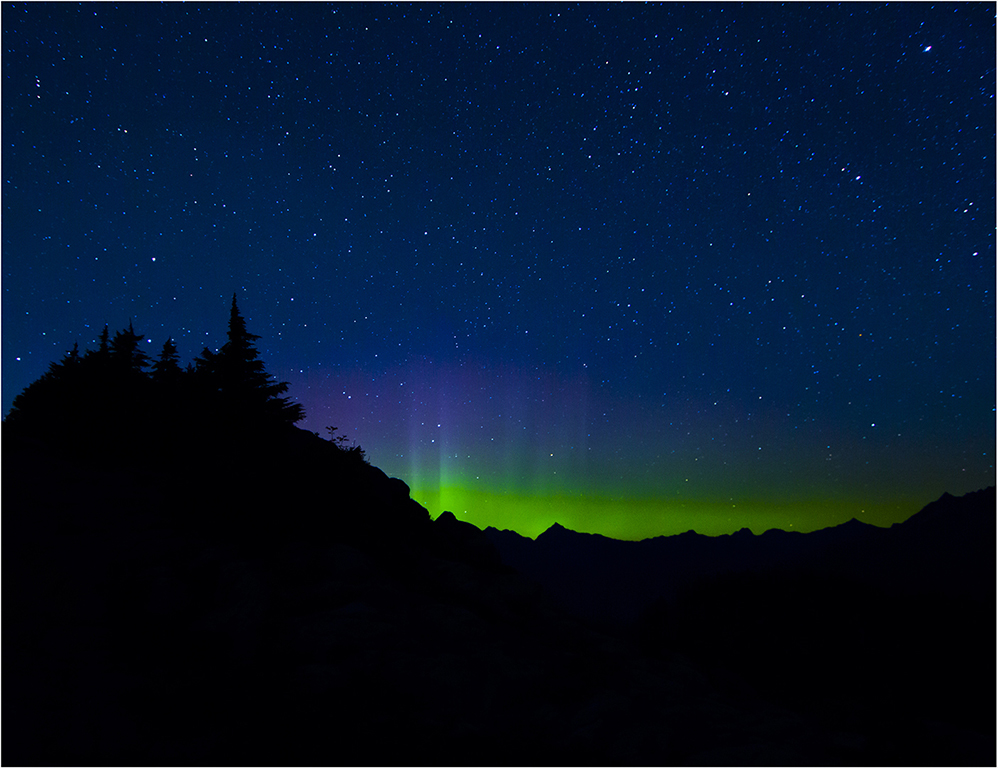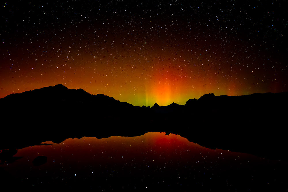 HM - "Aurora & Big Dipper Reflection" by Shane Elen © "Good composition. Horizon and reflection in lower third; all emanates from this. Colorful sky, silhouettes, unusually clear reflection of Big Dipper. This image demands a long look."