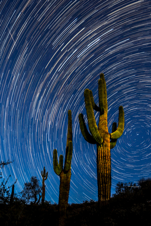 3rd - "Cactus Star Trail" by Bill Schwarz © "I like the image overall. I feel a different composition to help highlight the north star more could help and the random iridium flare on the left edge is distracting."
