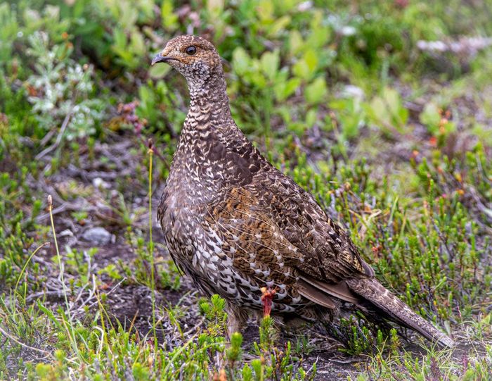 3rd - "Sooty Grouse" by Deb Smith © "Tech well done. Good use of focus to help bird stand out from background. Nice detail, color, and bokeh. Would have scored higher if the bird had been doing something. Good demonstration of camouflage, good catch light in eye."